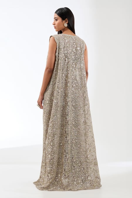 Intricate checkered pattern embroidery, Back deep square neck design, Metal thread and bead embellishments