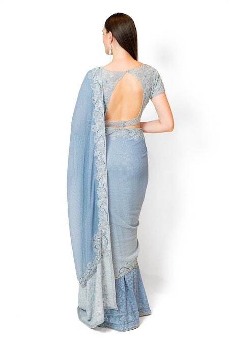 Blue saree featuring floral embroidered border with sequins work. Paired with a blouse showcasing floral bloom embroidery and short sleeves.