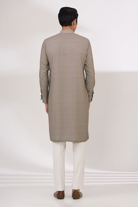 Grey kurta featuring abstract print and sequins embroidery with a mandarin collar. Paired with cotton silk pant for a complete look.