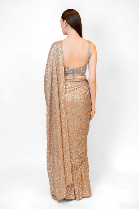 Gold Georgette Sequins, Pearls, Pre-stitched Jaal Embroidered Saree With Blouse