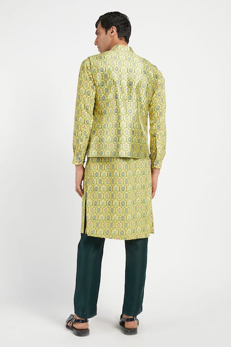 Yellow kurta with all-over floral print and full sleeves. Paired with bundi and green straight pant.