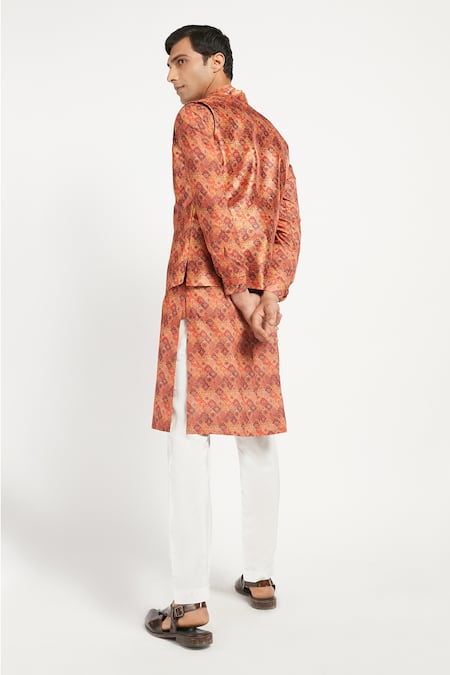 Coral kurta with all-over Mughal jaal print ad full sleeves. Paired with bundi and straight pant.
