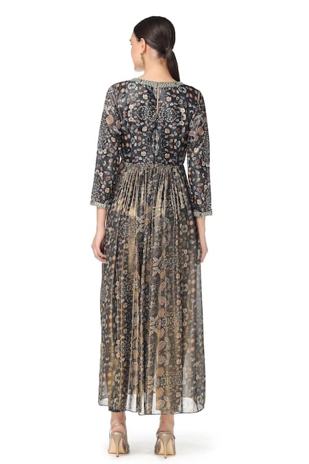Black Georgette, Dupion V Neck Printed Kurta And Pant Set