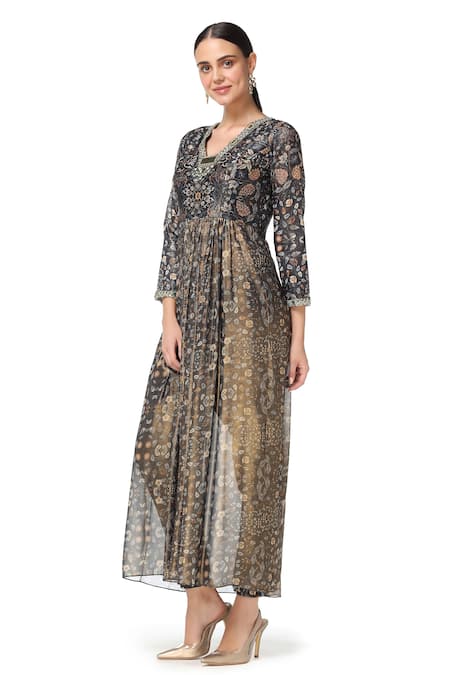 Printed >Asymmetric kurta >Hand embroidered neckline >Floral printed motifs