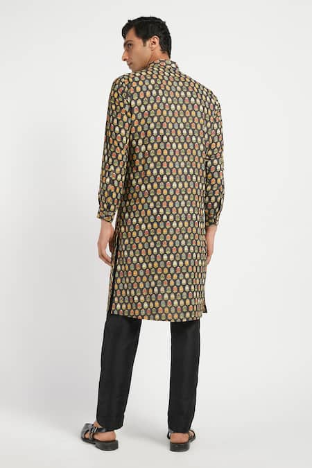 Black kurta with all-over Mughal booti and full sleeves. Paired with straight pant.