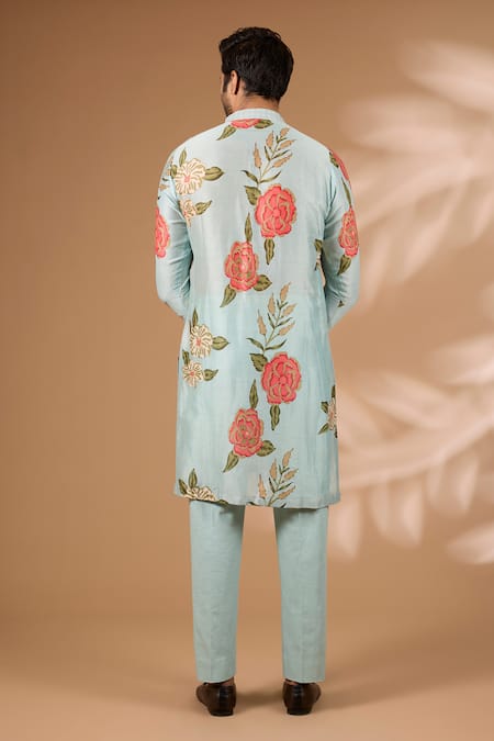Aqua silk floral printed kurta featuring sequin work on the collar, placket, and cuffs. Paired with matching cotton silk pants.