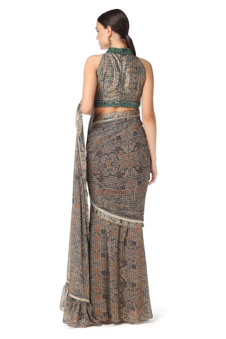 Olive green pre-stitched saree with floral printed motifs. Comes with embroidered blouse.