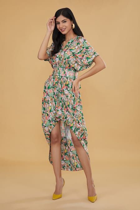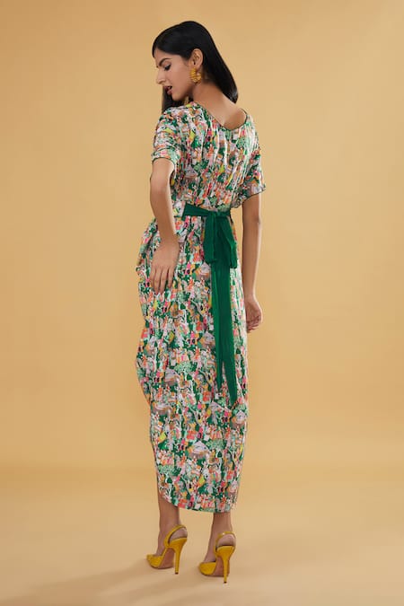 Green dress featuring Rajput print with batwing sleeves and an embellished belt. The dress has an asymmetric hemline and is crafted from crepe fabric.