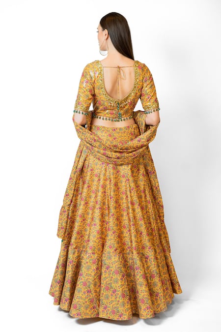 Mustard yellow lehenga featuring retro floral bloom print and ruffle hem. Paired with a blouse with sequin embroidery and a matching dupatta.