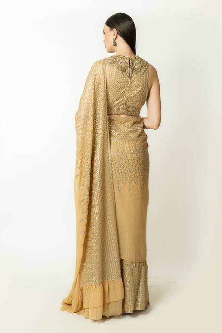 Gold georgette pre-draped palazzo saree featuring intricate embroidery with sequins, metal thread, pearls, and stones. Paired with a high neck sleeveless blouse with back hook closure.