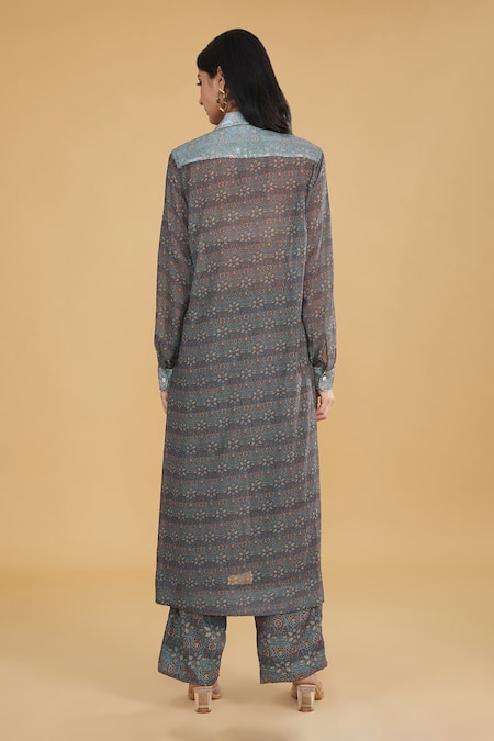 Teal grey straight kurta featuring a spread collar, full sleeves, and a front button placket. Paired with coordinating printed pants, both embellished with floral and sequin work.