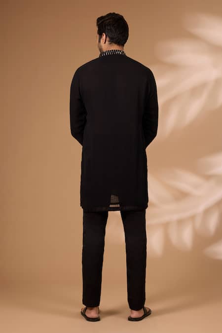 Black kurta featuring black and gold sequin embroidery on the front. Paired with plain black cotton silk pant.