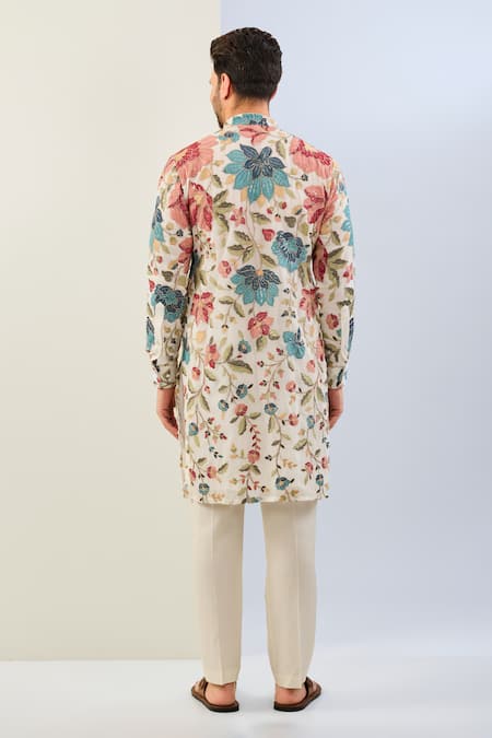 Off-white kurta featuring multicolor thread and sequin embroidery in floral pattern. Paired with a solid pant made from cotton silk.