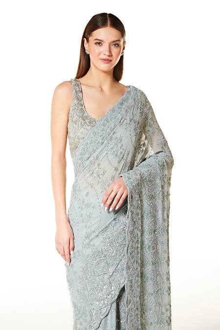 Silver grey saree featuring floral embroidered motifs with tonal sequin work. Paired with a sleeveless embroidered blouse and petticoat.