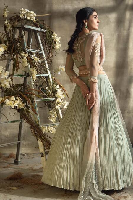 Grey lehenga with all-over crinkled pattern. Paired with embroidered blouse, ombre dupatta and belt.