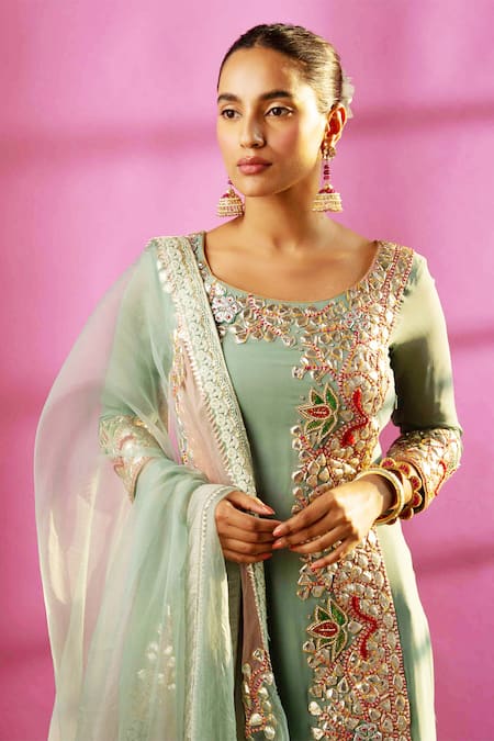 Teal blue kurta with floral gota embroidered motifs. Paired with embroidered hem sharara & dupatta.
