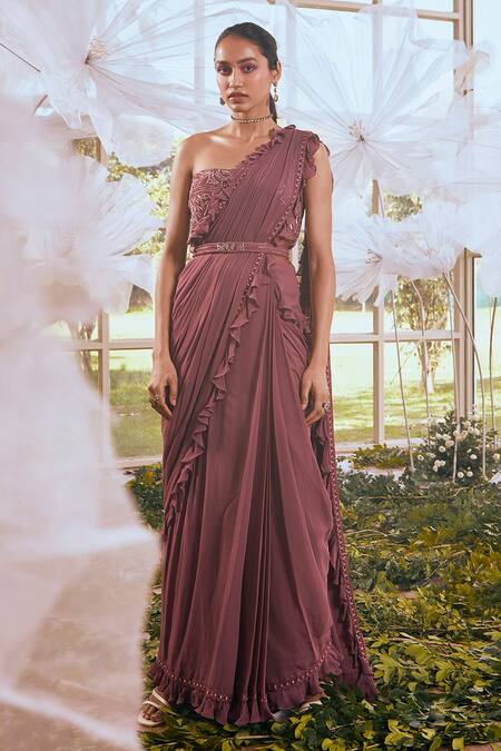 Purple pre-draped saree with ruffle hem & glass bead embroidered blouse. Comes with embroidered strapless blouse & geometric motif embroidered belt.