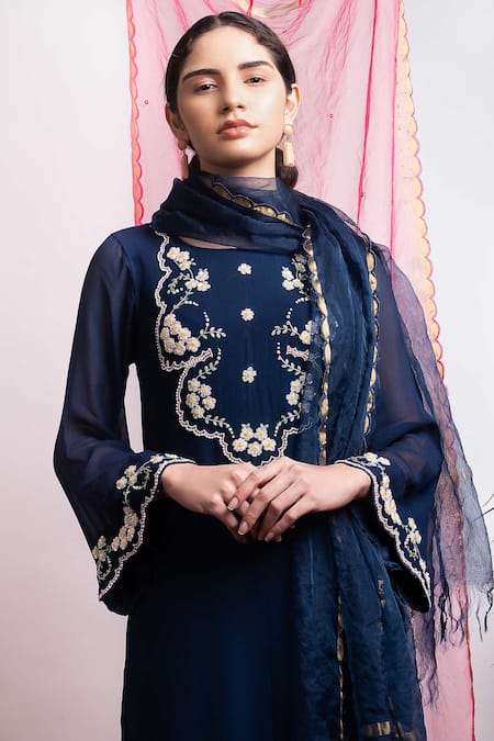 Navy blue kurta with hand embroidered glass beads & sequin work. Paired with crepe palazzo & silk organza dupatta.