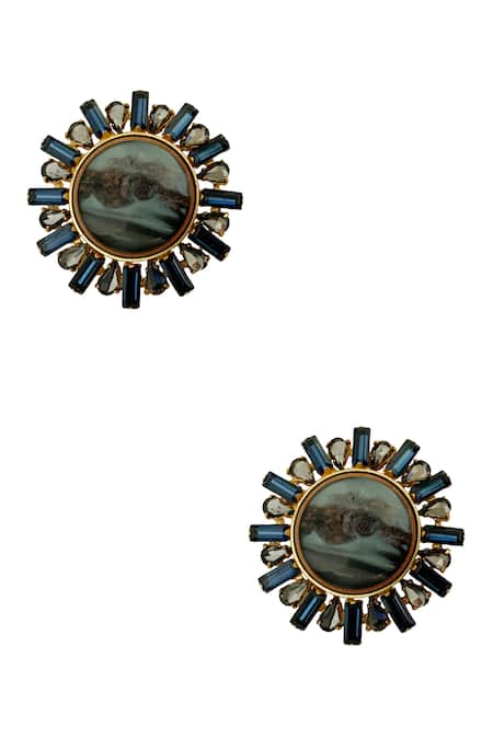 Gold-plated stud earrings featuring a sun motif design with encrusted midnight blue Swarovski crystals