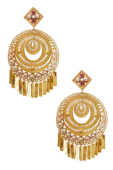 Gold long chandeliers featuring geometric tops with embellished pearls and Swarovski crystals