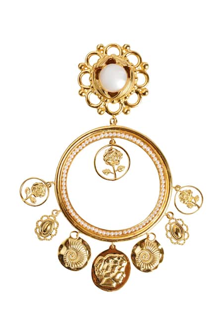 Floral top with pearl centerpiece, Multi-dangling decorative elements, Carved motifs enhancing design