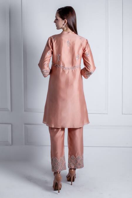 Peach Silk, Chanderi Pearls, Embroidery Collared Cleo Ivy Flora Kurta With Pant