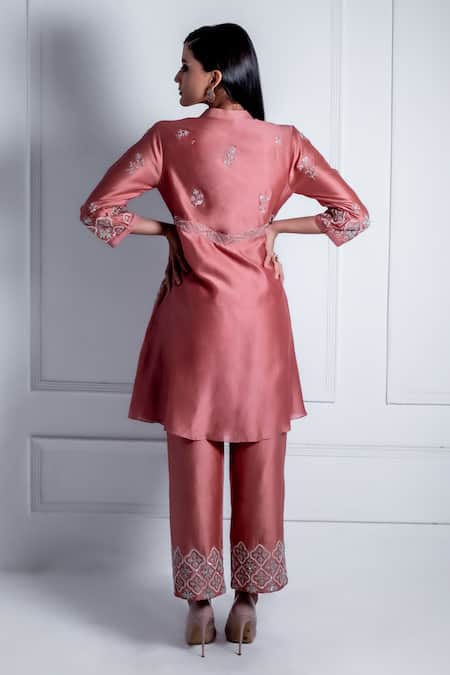 Pink Silk, Chanderi Pearls, Embroidery Collared Cleo Ivy Garden Kurta With Pant