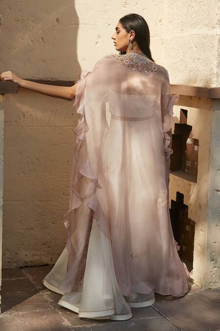 Lavender open front ruffle cape with floral embroidered motifs. Comes with ivory pleated structured bustier and lehenga.