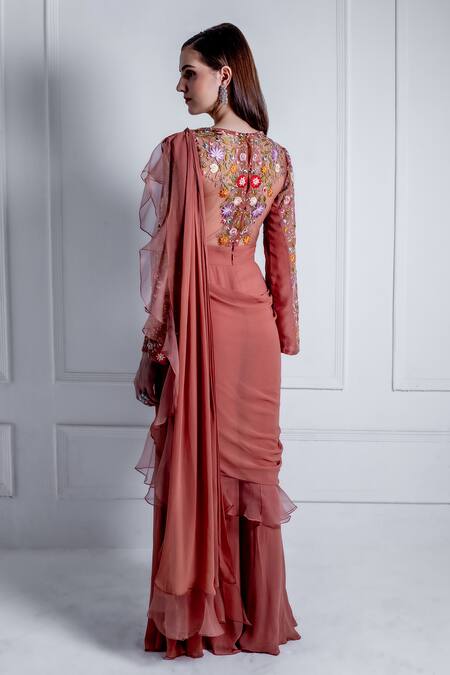 Salmon pink jumpsuit saree featuring a flared bottom with pleated cowl draped pallu. Embellished with floral pattern yoke and multi-color thread, sequin & beads embroidery.