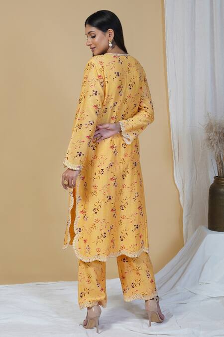 Yellow Silk And Cotton Floral Print & Thread Kurta Pant Set