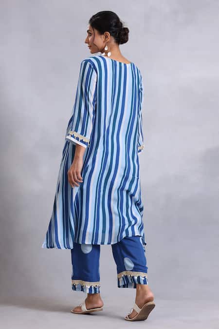 Blue kurta featuring an asymmetric hem with floral thread, sequin, and lace embroidery. Paired with pants that have a laced hem and inner.
