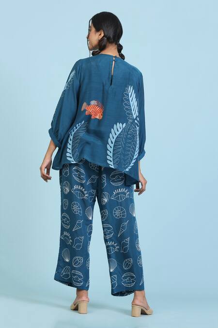 Blue Cotton, Silk Round Neck Coral Print Top Pant Set