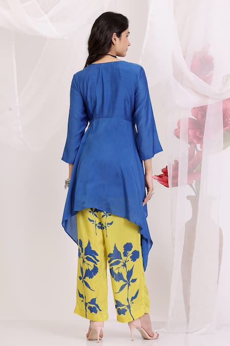Electric blue kurta featuring a gathered design with decorative embellishments. Paired with ochre yellow pants adorned with floral prints.
