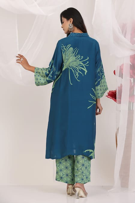 Collar with studded detail, Floral print on kurta, Patterned pant design