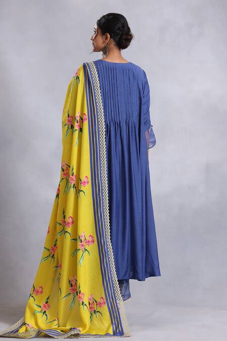 Buy_Radhika Jindal_Blue Cotton, Silk Beads, Sequins, Embroidery Floral Pintucked Anarkali Pant Set_at_Aza_Fashions