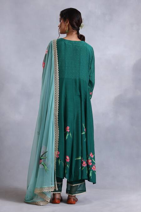 Buy_Radhika Jindal_Green Cotton, Silk, Chiffon Lace, Floral Pattern Embroidered Anarkali Pant Set