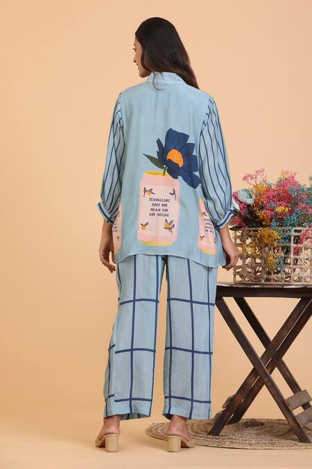 Floral stripe print on the top, Dark blue tie-ups at the neckline, Checkered pattern on the pants