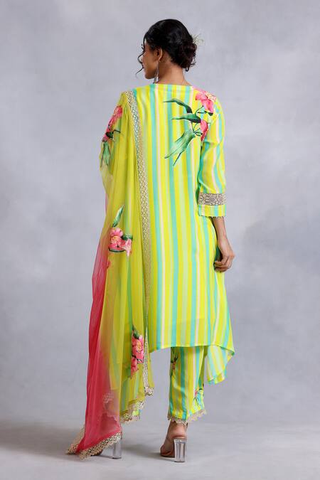 Buy_Radhika Jindal_Yellow Cotton, Silk, Chiffon Embroidery, Floral Stripe Pattern Kurta Pant Set_Online_at_Aza_Fashions