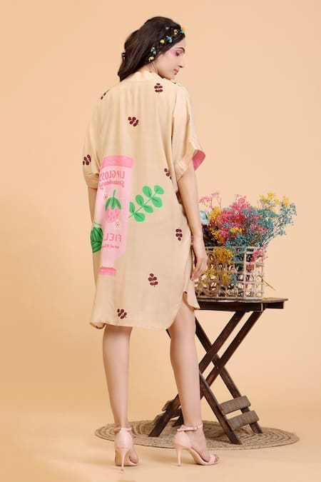 Beige shift dress featuring a lip gloss print and a neck tie-up. Designed with half sleeves and made from cotton silk fabric.