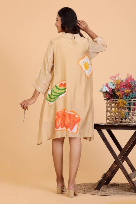 Gold Cotton, Silk Mandarin Collar Quirky Print Shirt Dress