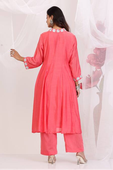 Buy_Radhika Jindal_Coral Cotton, Silk Embroidery Split V-neck Kalidar Set - And Grey_Online_at_Aza_Fashions
