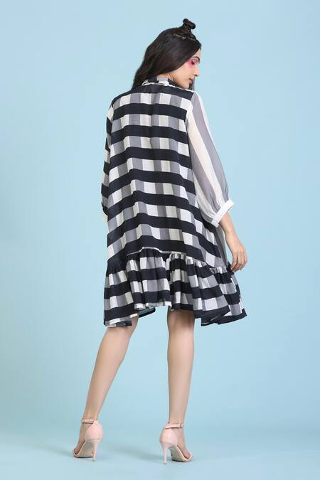 Black and white dress featuring a collared neckline, three-quarter sleeves, and a tiered hem. Designed with geometric and stripe prints, it includes an inner layer for added comfort.