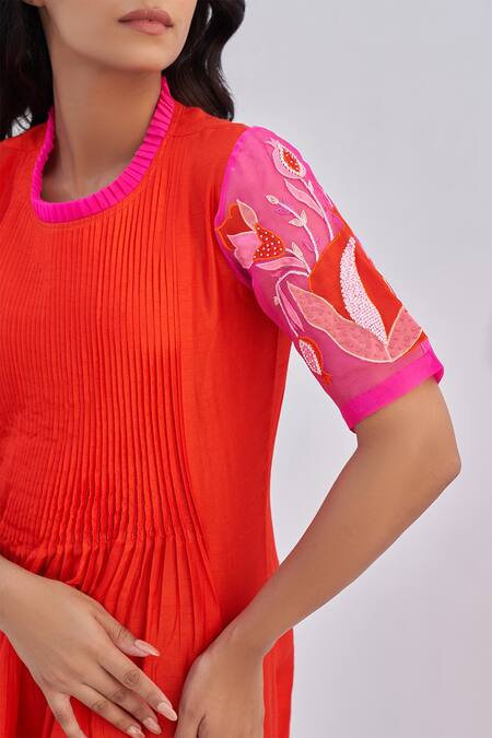 Pleated yoke detail, Sheer sleeves with embroidery, Cutwork hem design
