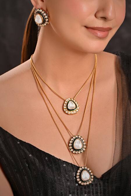 Gold toned layered pendant necklace featuring green polki embellishments. Paired with matching earrings adorned with polki stones.