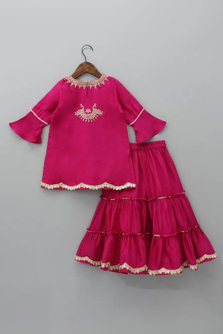 Pink kurta featuring zardosi bird embroidery and three-quarter sleeves. Paired with a matching sharara adorned with scalloped edges.