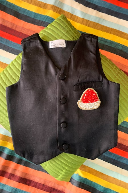 Black sleeveless Nehru jacket featuring hand embroidered Christmas ornament patches and bead detailing