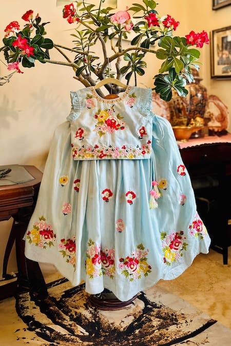 Blue Bamboo, Linen Embroidery Convent Floral Lehenga With Blouse
