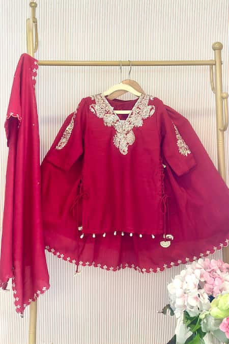 Red lehenga set featuring a kurta with intricate sequined embroidery and a matching dupatta. The kurta is paired with a flared lehenga and a beautifully embellished dupatta.