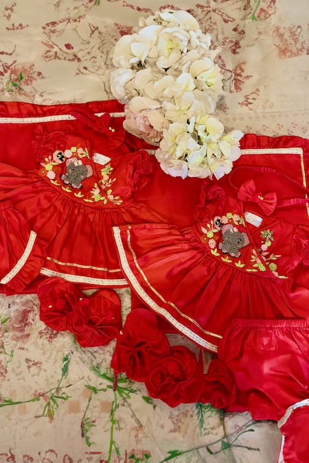 Red cotton silk dress featuring a surplice neckline and puff sleeves. Paired with bloomers, hairband, mittens, shoes, and a wrapper, all adorned with intricate bead and 3D floral embroidery.