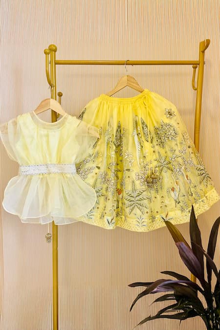 Yellow lehenga featuring flamingo floral embroidery and a layered organza top. The lehenga has intricate floral designs and a lace trim at the hem.